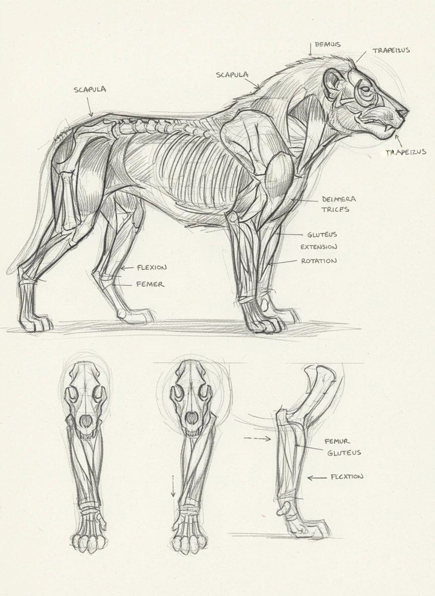 Generate an animal anatomy study with a sketch generator, focusing on structure and muscle flow. The sketch should appear like a study page with confident but rough pencil strokes. Keep it educational and minimal. Tags: anatomy sketch, animal study, pencil | NEG: color, realism, fur detail overload, blur, distortion