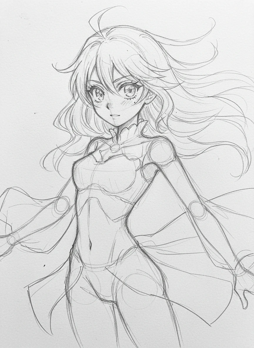 Use a sketch generator to create an anime-style character drawn in clean pencil lines. Focus on expressive eyes, simplified anatomy, and visible construction lines. The sketch should look unfinished and exploratory. Tags: anime sketch, character design, pencil | NEG: full color, realism, heavy rendering, blur, artifacts
