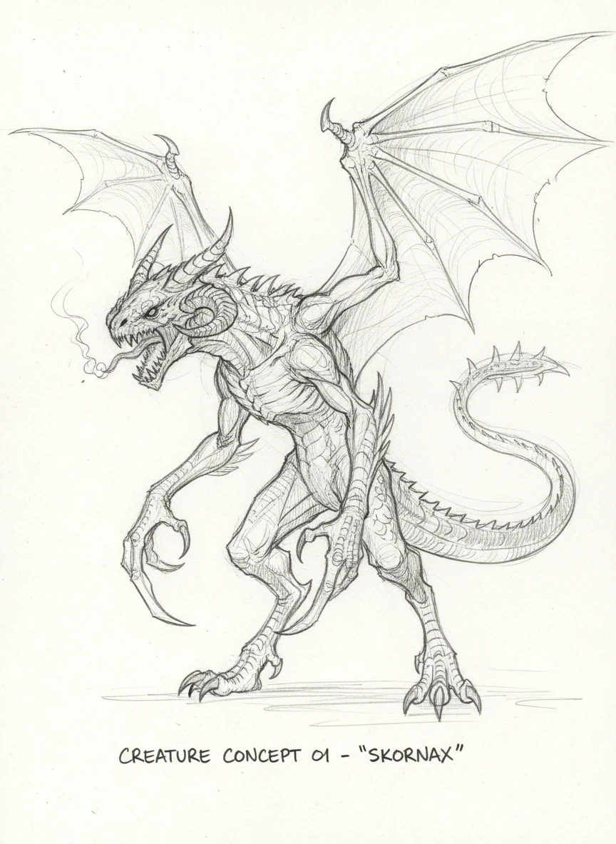 Create a fantasy creature using a sketch generator, drawn as a rough concept with dynamic pencil lines. The anatomy should be imaginative yet readable, like an early game or film design draft. Keep the background plain to emphasize the creature form. Tags: creature design, fantasy sketch, concept | NEG: realism, color rendering, polished art, blur, symmetry errors