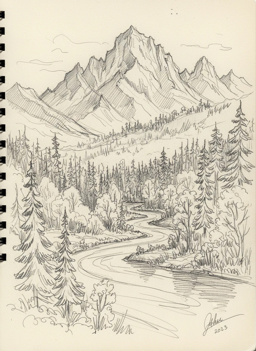 Generate a hand-drawn nature scene with a sketch generator, showing mountains, trees, and a river using loose pencil strokes. The style should resemble an outdoor artist’s travel sketchbook. Focus on organic lines and light shading. Tags: landscape sketch, pencil, nature | NEG: vivid colors, digital painting, realism, over-detail, blur, artifacts