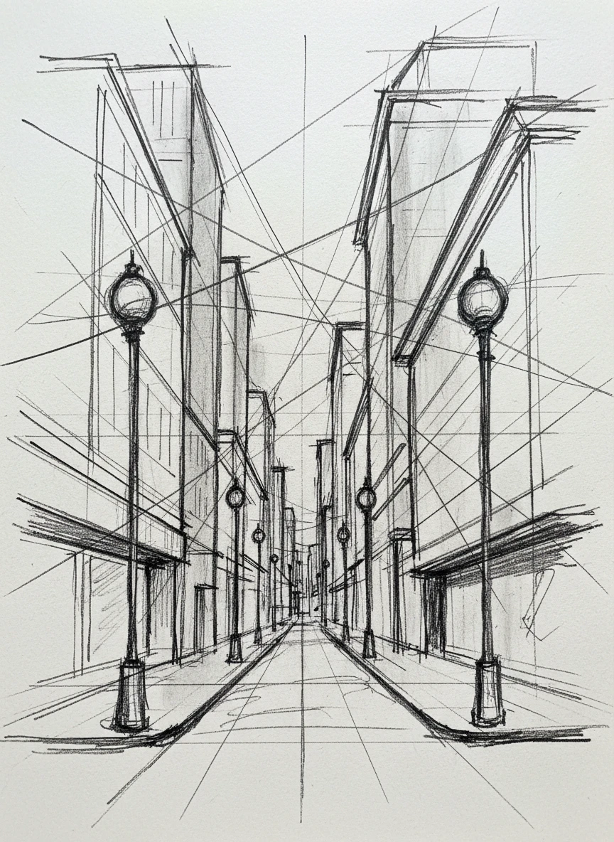 Generate an urban street view with a sketch generator, featuring buildings, lamps, and light perspective lines. The sketch should feel quick and observational, like an artist drawing on location. Use loose strokes and minimal tonal shading. Tags: urban sketch, perspective, line art | NEG: color, hyper-detail, photorealism, crowd clutter, noise