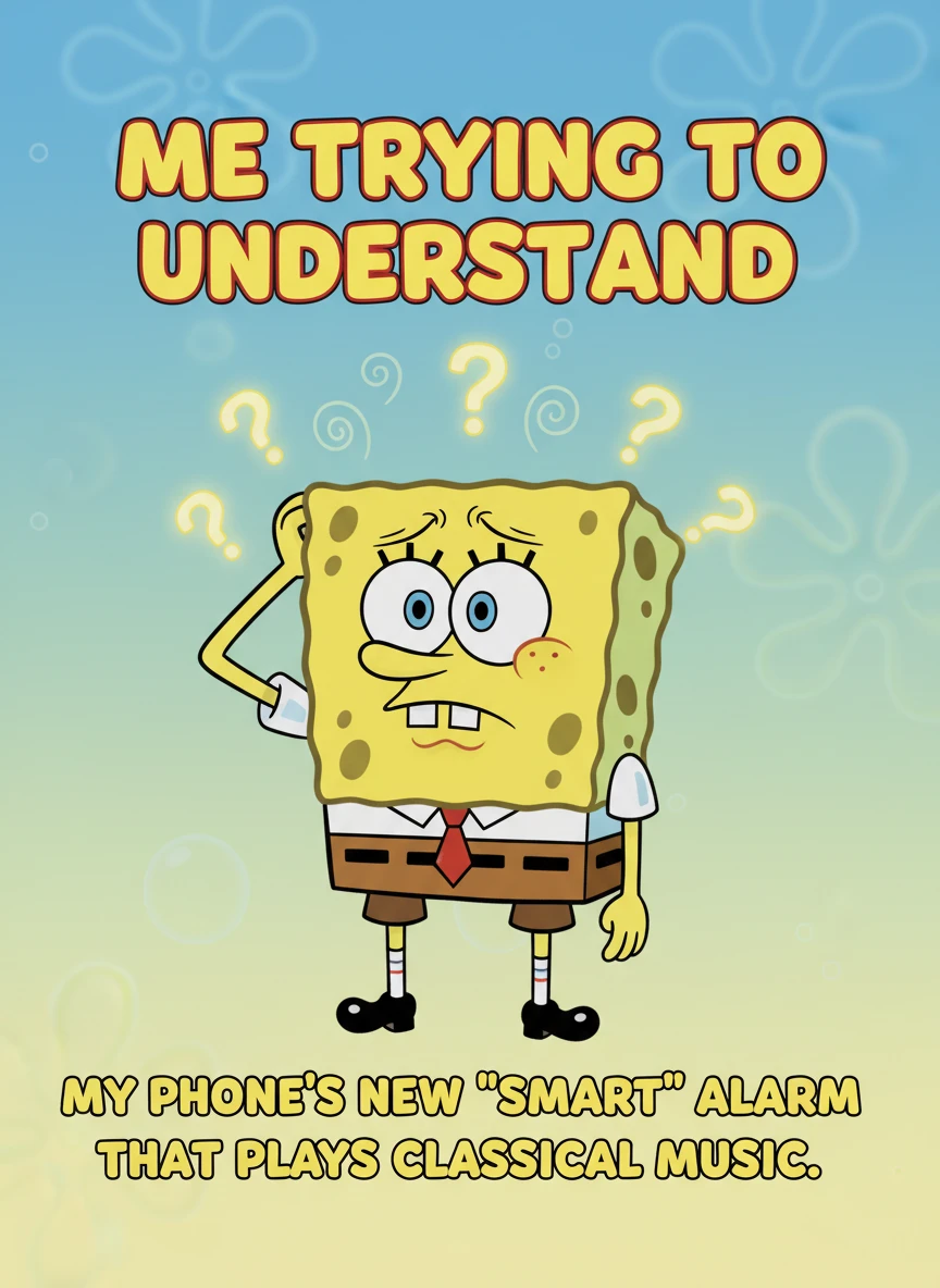 Produce a SpongeBob Meme generator image where SpongeBob looks confused, scratching his head with question marks around him. Add a caption expressing confusion about a common life situation. Keep the layout simple and clear. reaction, simple-background, humor NEG: noisy background, harsh shadows, realistic skin, tiny text, uneven framing, artifacts