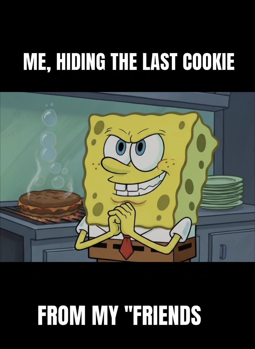 Design a SpongeBob Meme generator meme with SpongeBob wearing a mischievous grin, hands clasped as if plotting. Use slightly darker but still cartoonish tones to sell the joke. Caption should imply sneaky or ironic intent. mischief, cartoon-style, bold NEG: horror style, extreme darkness, realism, scary teeth, unreadable caption, blur