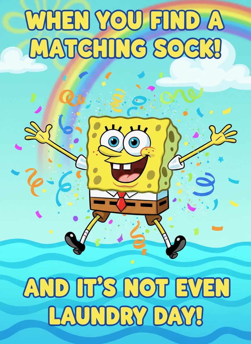 Generate a SpongeBob Meme generator image with SpongeBob jumping in joy, arms wide, celebrating a small win. Use vibrant colors, confetti, and a cheerful caption that feels wholesome and funny. The mood should be energetic and positive. joyful, vibrant, cartoon NEG: muted colors, realism, stiff pose, flat lighting, pixelation, awkward text placement