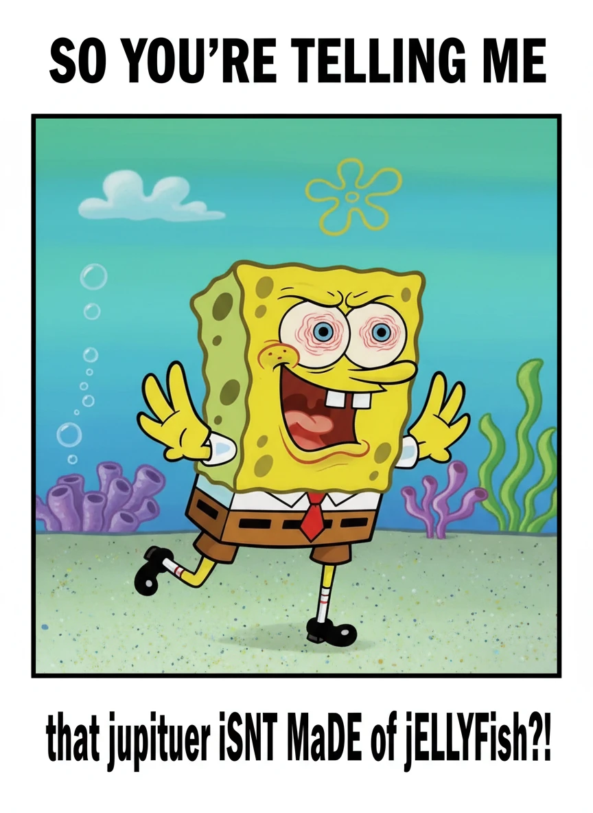 Create a sarcastic SpongeBob Meme generator image featuring SpongeBob in the iconic chicken pose, alternating uppercase and lowercase text to mock a silly statement. Use a bright Bikini Bottom background with exaggerated facial expression and bold meme-style caption at the top and bottom. The tone should be playful, instantly readable, and internet-classic. cartoon, bright-colors, meme-style NEG: blurry, realistic, dark lighting, low contrast, extra limbs, distorted face, unreadable text