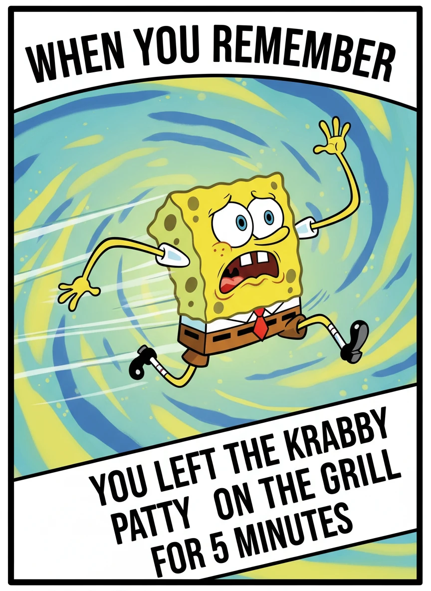 Illustrate a SpongeBob Meme generator meme with SpongeBob running in panic, eyes wide and limbs flailing. Use motion lines and a dramatic caption to enhance urgency. The final image should feel chaotic yet fun. dynamic, high-energy, meme NEG: static pose, low contrast, realistic motion blur, text overlap, cropped character, dull scene