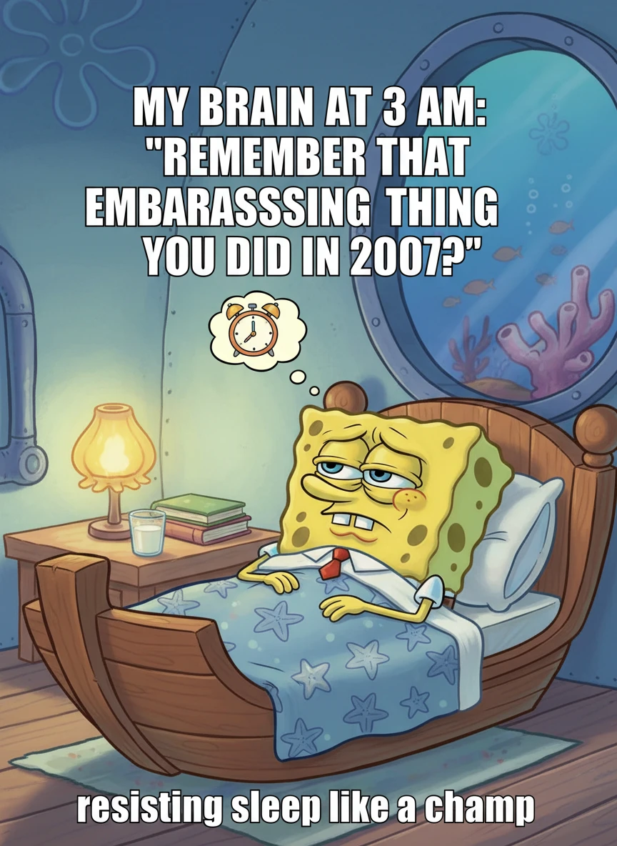 Generate a SpongeBob Meme generator scene of SpongeBob tucked in bed, eyes barely open, clearly resisting sleep. Include a relatable night-time caption in meme font. The vibe should be cozy and funny. cozy, soft-colors, cartoon NEG: harsh lighting, photorealism, clutter, incorrect bedding, stretched face, text noise