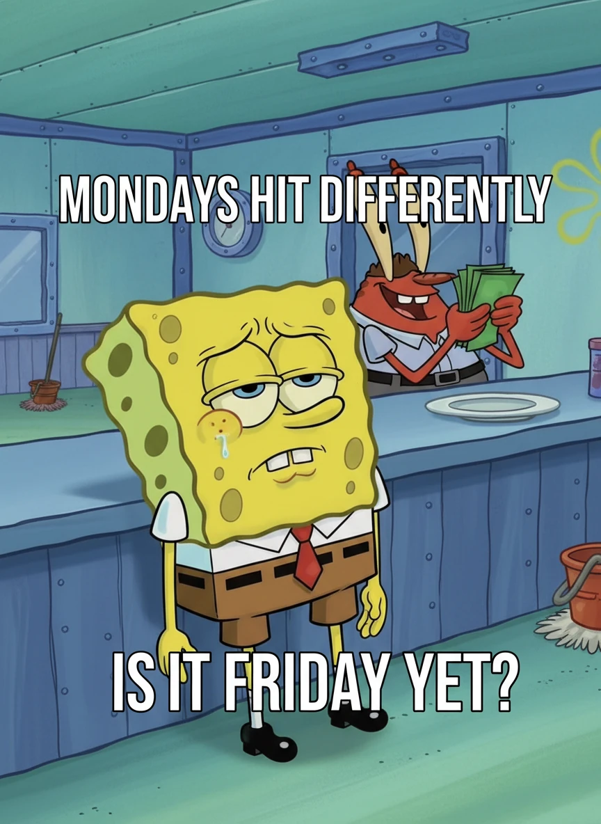 Design a SpongeBob Meme generator scene showing SpongeBob exhausted at the Krusty Krab, leaning on the counter with half-closed eyes. Add a relatable caption about overwork or Monday fatigue in clean bold text. Keep the humor subtle and highly expressive. cartoon, workplace-humor, expressive NEG: photorealistic, messy text, dull colors, cropped head, warped anatomy, shadows over face
