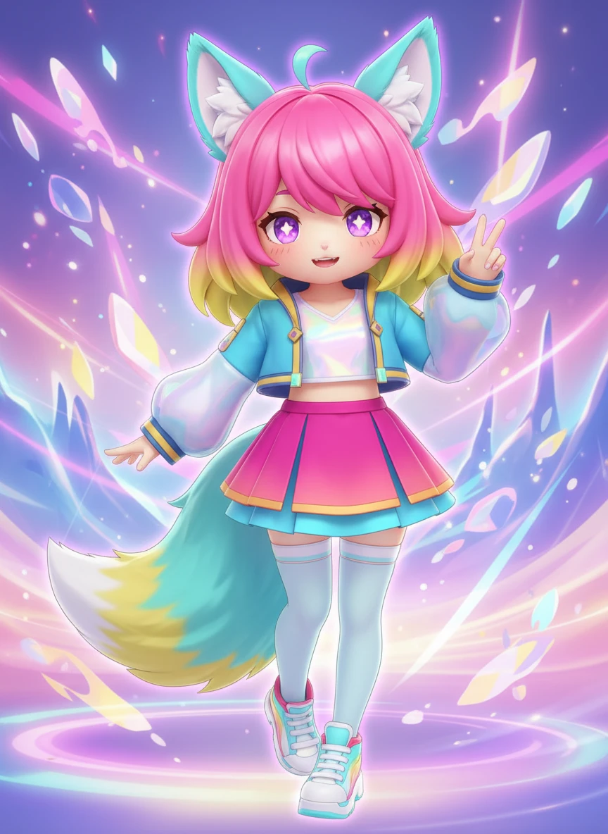 Generate a unique animal-human hybrid VTuber avatar with cute ears and tail using an AI VTuber Maker. The design should be playful yet clean, ensuring facial features remain clear for expression tracking. Bright colors and smooth gradients are preferred. kemono, vtuber, colorful NEG: feral anatomy, realism, extra limbs, clutter, blur, dark tones