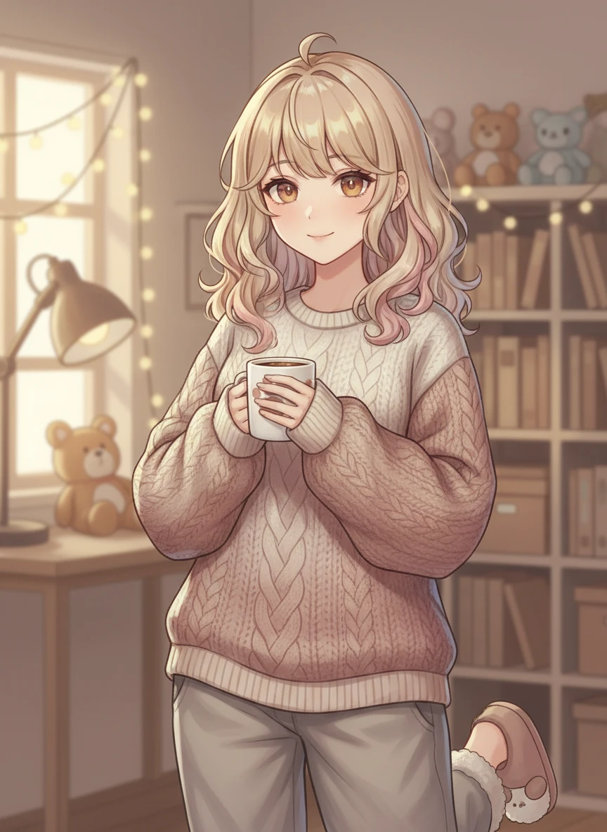 Create a cozy, soft-style VTuber avatar wearing casual clothing using an AI VTuber Maker. The character should feel warm and approachable, ideal for chatting or study streams. Muted colors and gentle lighting improve comfort. cozy, soft anime, vtuber NEG: harsh contrast, busy background, photorealism, blur, extra fingers, text