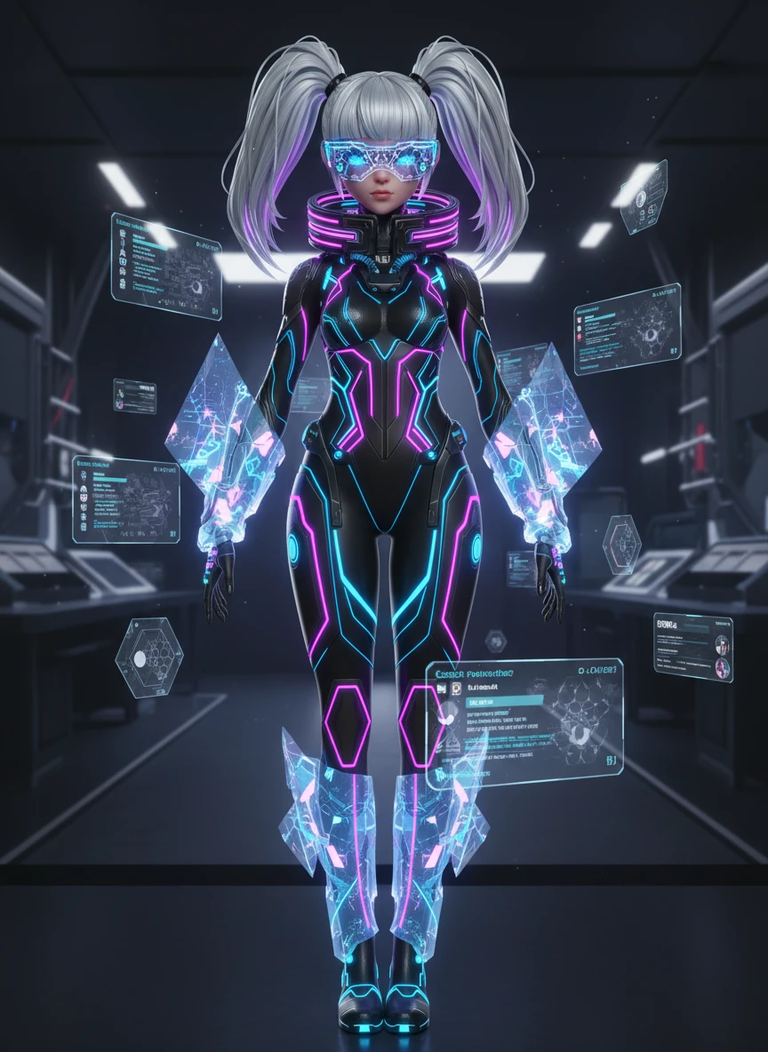 Design a futuristic cyberpunk VTuber character with neon accents and holographic accessories using an AI VTuber Maker. The avatar should look stream-ready with clear facial features, glowing eyes, and a tech-themed outfit. Emphasize symmetry and strong lighting for motion capture compatibility. cyberpunk, neon, vtuber NEG: grainy, overexposed, distorted face, messy hair, background noise, realism, logo