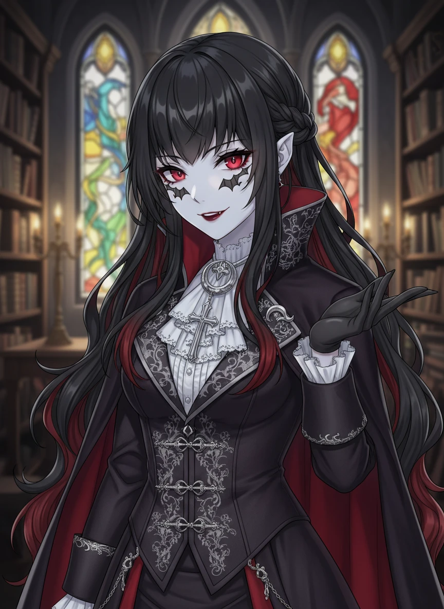 Design a gothic vampire-themed VTuber avatar with pale skin, red eyes, and stylish dark attire using an AI VTuber Maker. The character should appear expressive and camera-friendly, suitable for horror or lore-based streams. Use clean shading and controlled contrast. gothic, vampire, anime NEG: horror gore, excessive darkness, blur, asymmetry, realistic blood, text overlay