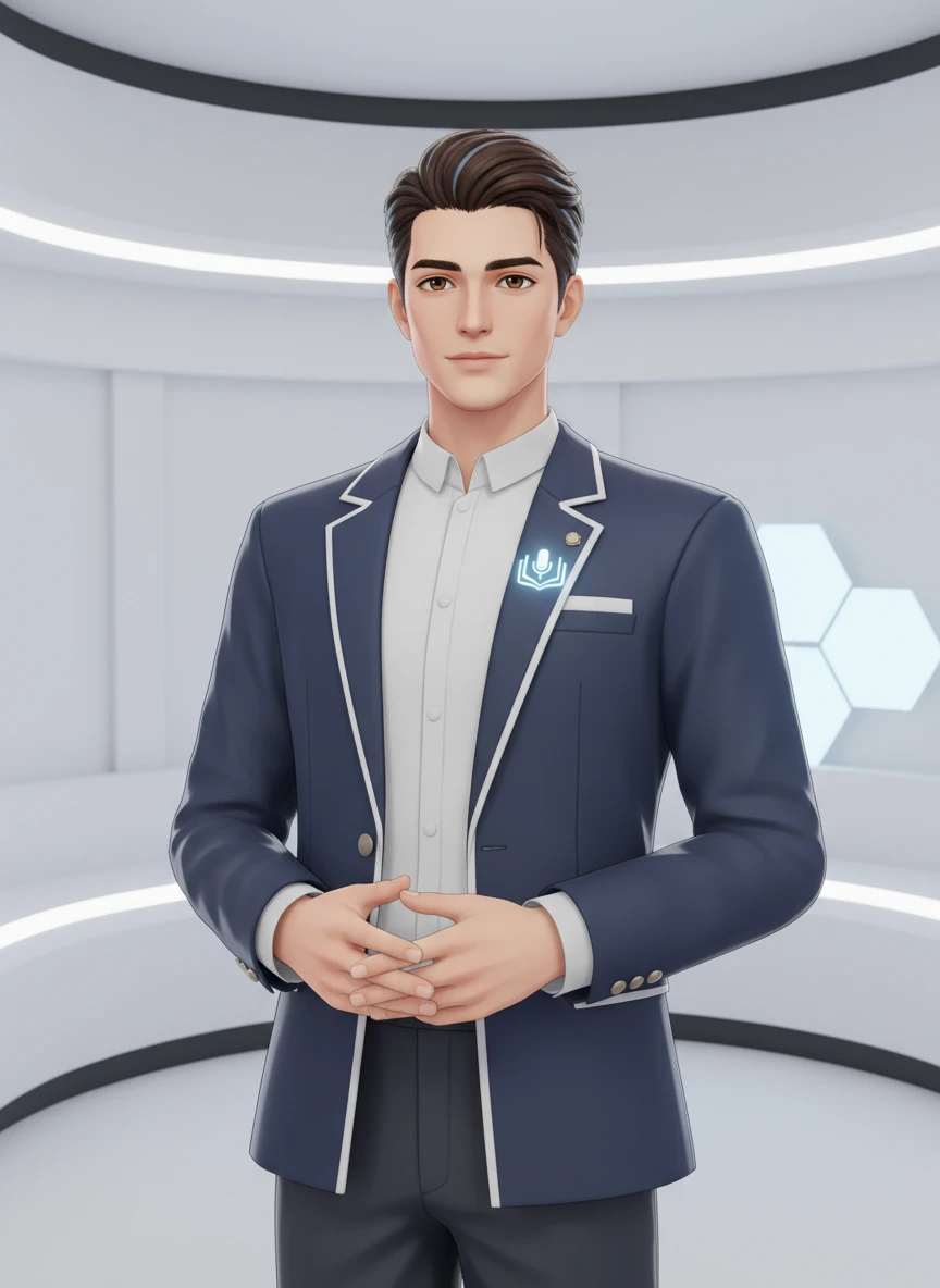 Create a professional-looking male VTuber avatar with a calm expression and modern outfit using an AI VTuber Maker. The character should be neutral, friendly, and optimized for talk shows or educational streams. Simple background and balanced colors for long streaming sessions. male vtuber, clean design, modern NEG: aggressive pose, messy hair, low detail, realism, harsh shadows, watermark