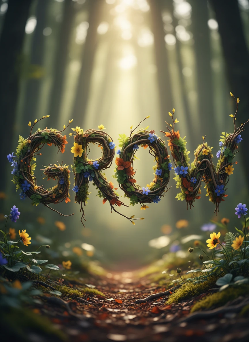 Generate a word art generator visual where the word is built entirely from natural elements like leaves, flowers, vines, and wood textures. The composition should feel organic and harmonious, with realistic details and soft lighting. Maintain clear letter shapes while integrating nature seamlessly. Style tags: nature, organic, artistic NEG: artificial textures, broken letterforms, flat lighting, visual noise, unrealistic proportions